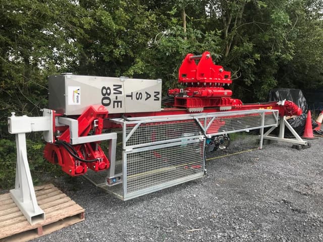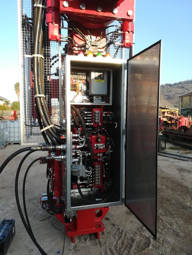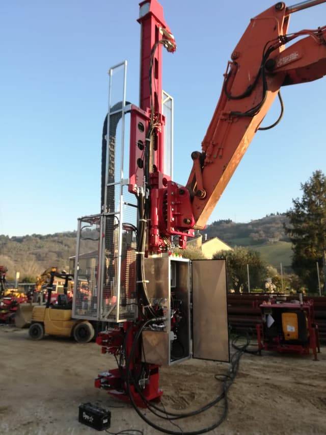 DRILLING MAST MOD. M-E-80 – To drill with 8” diameter with drifter This drilling machine is designed for the execution of micropiles, etc. The structure is made of electrowelded steel. CE regulation conformity. Excavator (Minimum weight): 21–25 ton Quick hydraulic coupling For the correct operation of the mast on the excavator it is necessary: 300 L/min @ 280 bar max Fifth wheel mast with hydraulic motors and worm screw 360° Counterslide with hydraulic jack 1042 mm Drilling mast – with gear motor and chain transmission Useful stroke: 4500 mm Total length: 7013 mm Pull Up / Pull Down: 8000 kg Rotary trolley with plastic guides and centering with bearings Drifter: EURODRILL RH 24 X