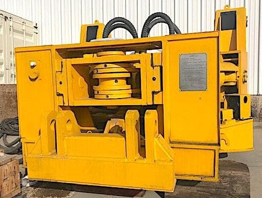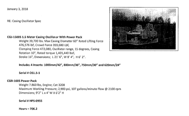 Used CGJ-1500S Casing Oscillator Institute of Technology 1.5M. Drill Mount Oscillator with Powerpack. 1500mm, 60" max casing diameter. 476,000# lifting force, 359,000# crowd force, 472,000# clamp force, 1,400,000# torque, 120 degree casing rotation, 16" stroke. Power pak with Cat 3208 engine. rexroth pumps. Very low hours and in excellent shape. Comes with 4 inserts, 1000mm/42", 880mm/36", 750mm/30" and 620mm/24". Available For Rent.